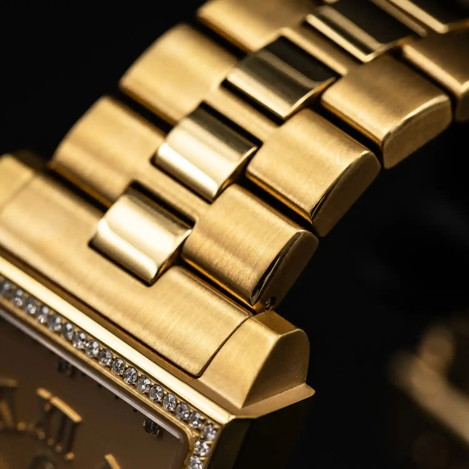 スクエア型のフェイスに対してサークル型のローマンインデックス、トータルで10石のダイヤモンドをフェイスに沿ってスクエア型にセッティングした、他の時計にはなかなか無いようなデザインを施しています。サイドから見たときにカーブした造りにすることで腕へのフィット感も増した仕上がりに。