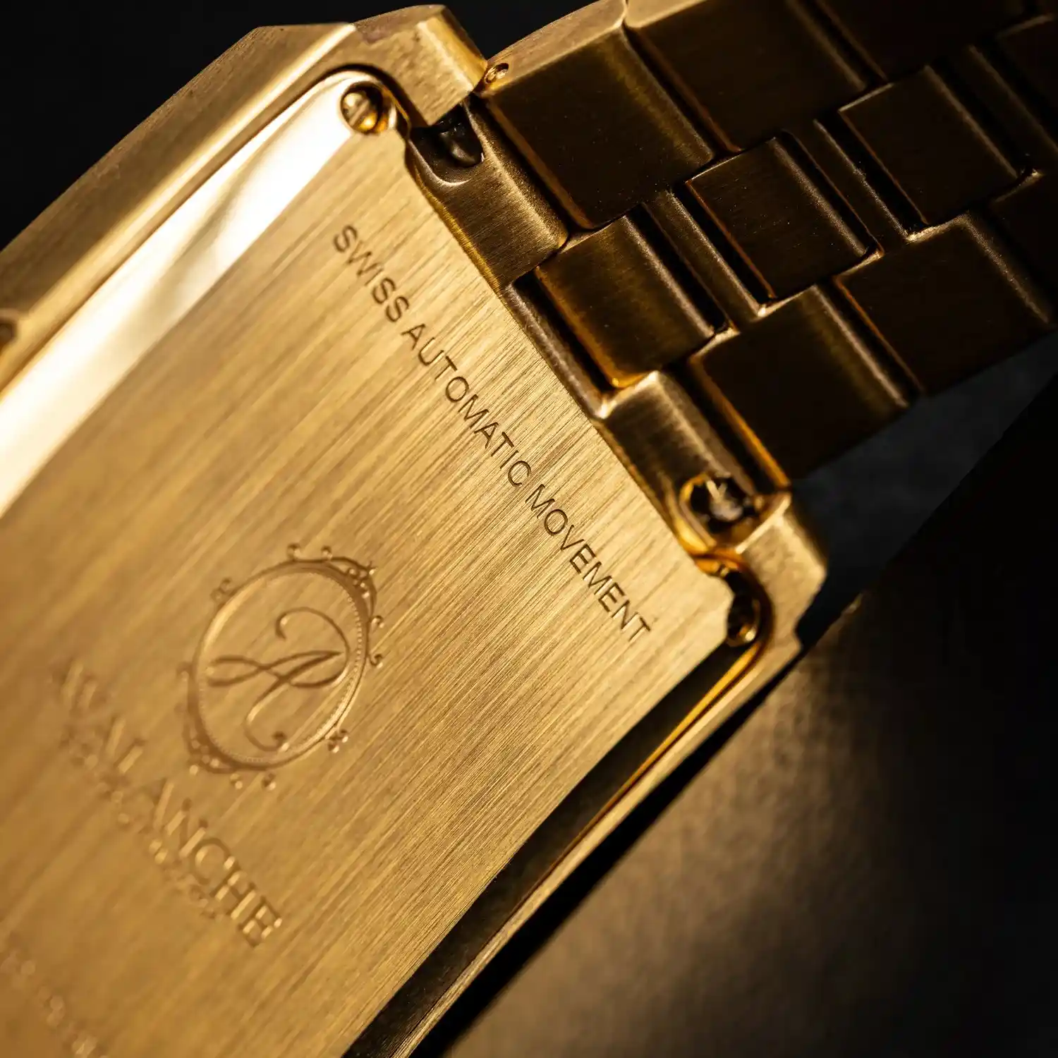 裏蓋はヘアライン加工でマットな仕上げにし、アヴァランチのロゴを刻印しています。